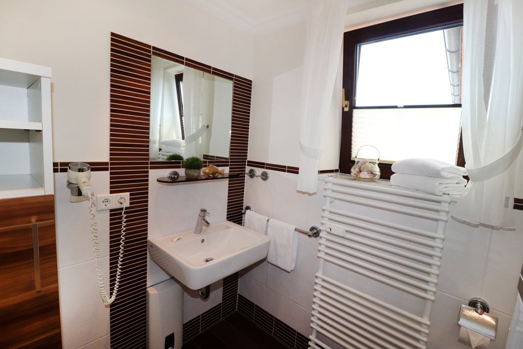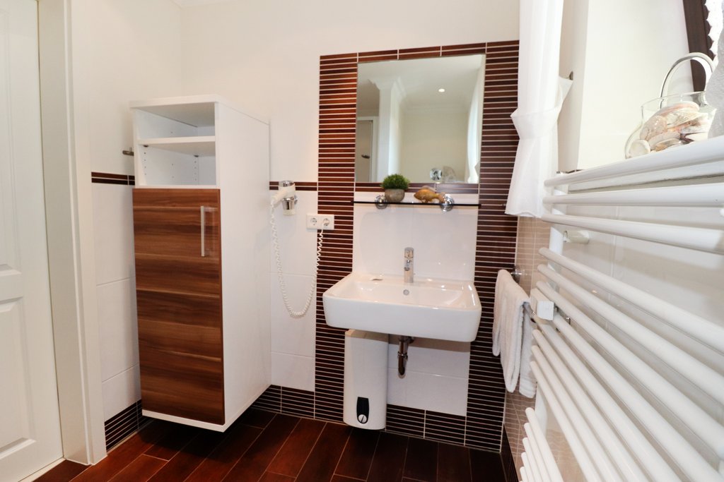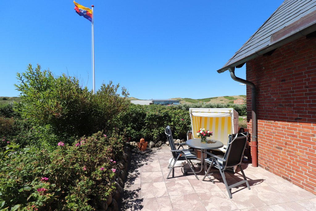 Dusche, Waschbecken, WC. Terrasse mit Stühle/Tisch, Strandkorb.